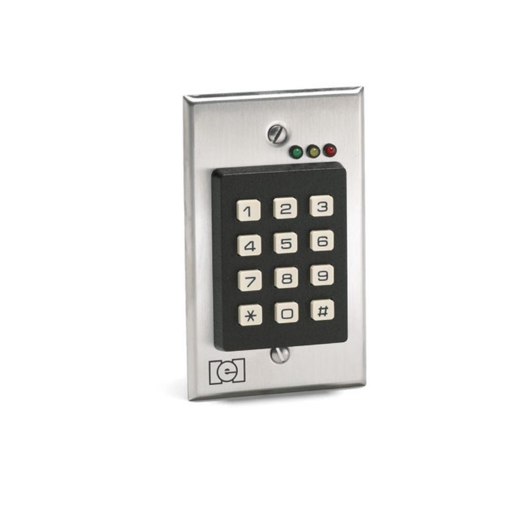 Affordable single door access control keypad designed to meet the indoor flush mount needs of lighter volume access control environments. There are three LEDs to indicate operation status and provide the user with visual PIN entry confirmation. The I-style keypad mounts to most standard single-gang electrical back boxes.