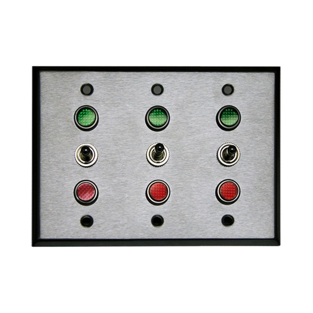 Three Gang Switch assembly with indicator lights and brushed stainless-steel cover plate. (3) 3-position SPDT On/Off/On switch(es). Electrical box not included. Voltage: 120VAC