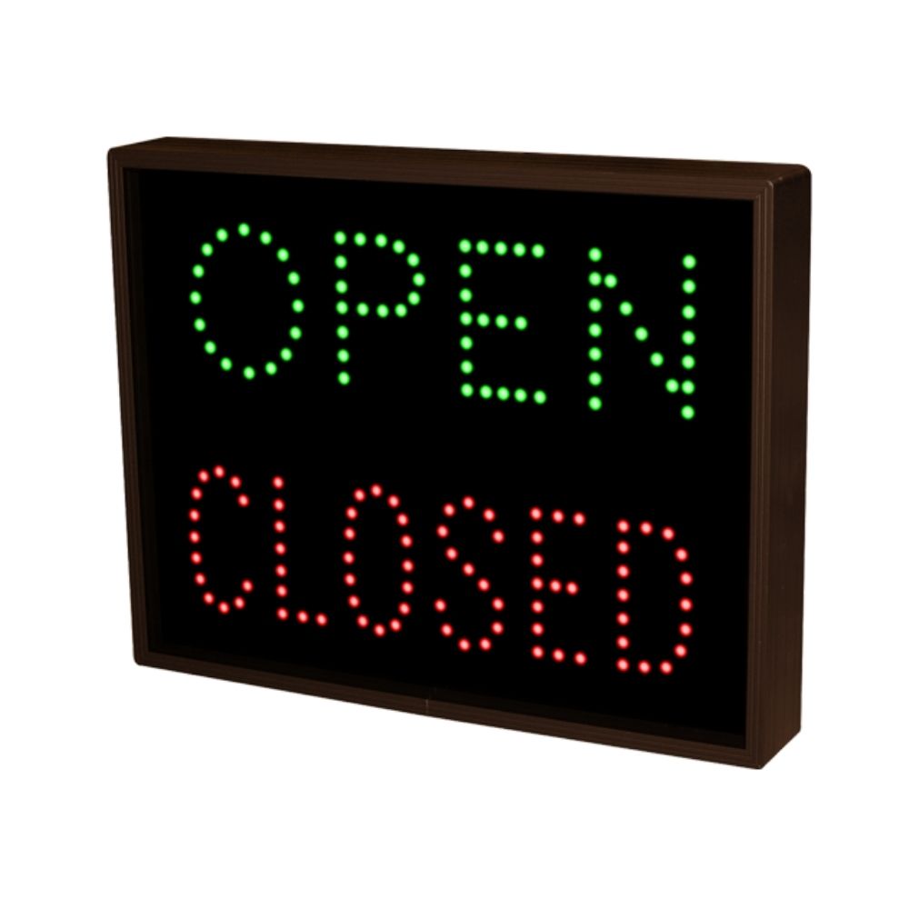 This TCL Series OPEN | CLOSED (120-277VAC) outdoor, blank-out sign is designed with super bright LEDs and a contrasting face; we guarantee it’s readable in direct sunlight. The sign message is formed by visible LEDs on a black sign face and is designed to illuminate the message(s) when turned on and blank out or extinguish the message when off.It is engineered with a solid-state circuit board and switch-mode power supply for maximum LED life. The cabinet is constructed of corrosion-resistant, extruded aluminum, and ships with our Lift’N Shift back for wall mounting. Ceiling, post, and wall-projection mountings are available. The standard cabinet finish is Duranodic Bronze; custom paint finishes are available. The sign can be controlled by a switch or third-party relay. Control switches can be purchased separately. UL/cUL Listed for wet locations.