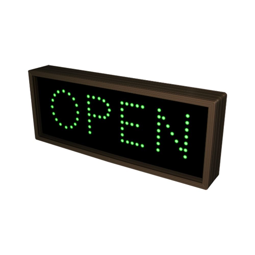 This TCL Series OPEN (120-277VAC) outdoor, blank-out sign is designed with super bright LEDs and a contrasting face; we guarantee it’s readable in direct sunlight. The sign message is formed by visible LEDs on a black sign face and is designed to illuminate the message(s) when turned on and blank out or extinguish the message when off.It is engineered with a solid-state circuit board and switch-mode power supply for maximum LED life. It has a corrosion-resistant, all-weather cabinet and ships with our Lift’N Shift back for wall mounting. Ceiling, post, and wall-projection mountings are available. The standard cabinet finish is Duranodic Bronze; custom paint finishes are available. The sign can be controlled by a switch or third-party relay. Control switches can be purchased separately. UL/cUL Listed for wet locations.